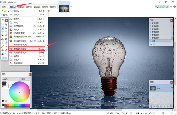 5、接着,再点击菜单栏“编辑”中的“清空选择区域”,或者也可以直接按下快捷键“Delete”将灯泡外的所有区域图像删除。