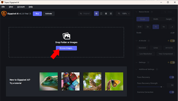 1、打开Topaz Gigapixel AI,接着点击正中间的Browse Image来选择我们想要放大的图片