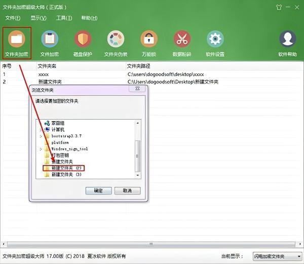运行文件夹加密超级大师,点击文件夹加密超级大师窗口上的[文件夹加密]按钮,然后在弹出的窗口中选择需要加密的文件夹,点击“确定”。然后后在弹出的文件夹加密窗口中设置加密密码,选择加密类型,然后点击“加密”。