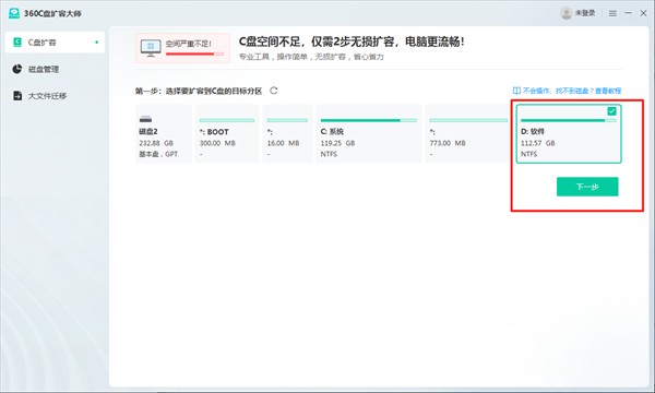 1、进入360C盘扩容大师的C盘扩容页面,选择一个剩余空间较多,可以扩容到C盘上的分区,如下图拿D盘举例;