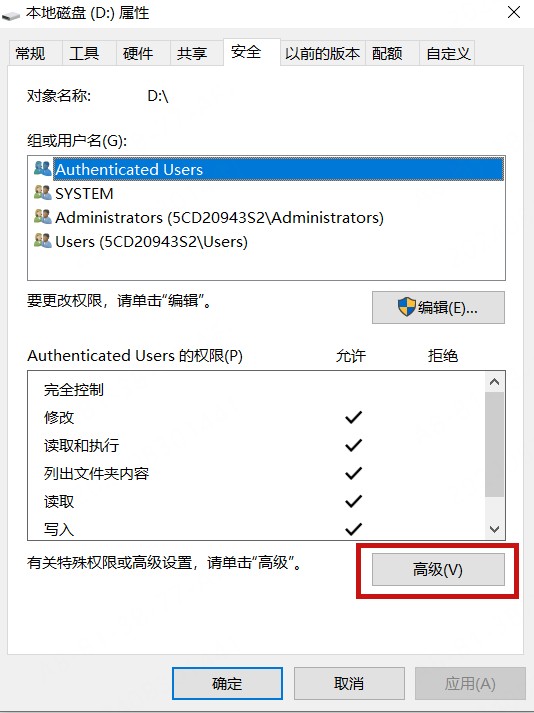 1、右键单击D盘,选择“属性”。在弹出的弹窗里,点击“安全”,点击“高级”。