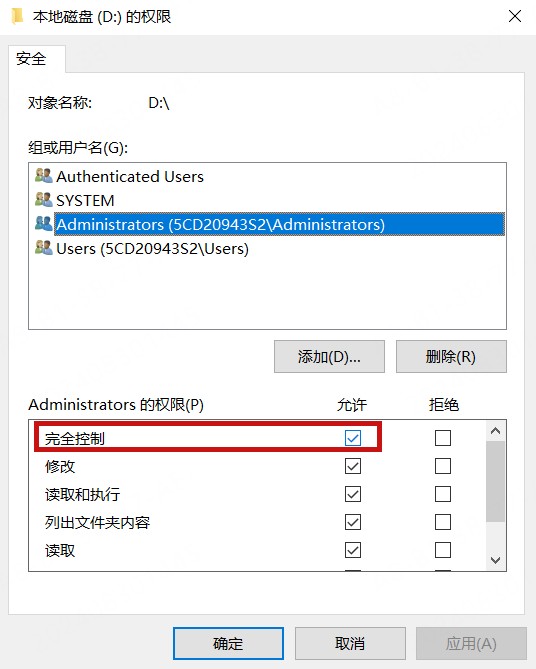 5、在“组或用户名”下选择你刚刚填写的用户帐户,并将权限设置为“完全控制”点击“应用”。如有拒绝的取消勾选。点击确定