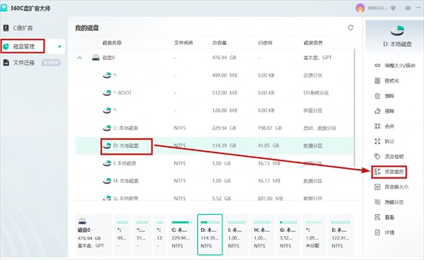 打开360C盘扩容大师,进入磁盘管理页面,选中这个无法打开的盘,右侧点击修改盘符操作。将盘符修改成一个其他未被使用的盘符即可。