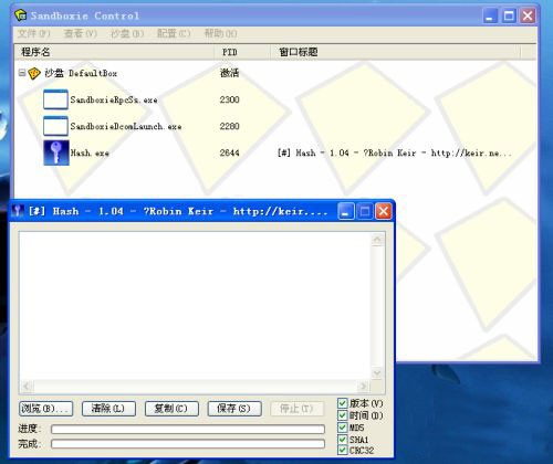 2、需要安装的软件在软件中运行的方法:同样先打开主程序,然后鼠标选中并拖动要运行的软件,拖动到界面内后,看沙盘主界面中显示的软件进程有没有和所运行的软件不相关的进程,这里以hash软件为例