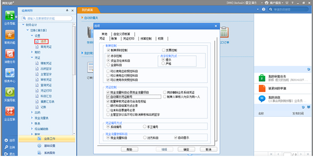 在选项中设置是否填补凭证断号,是否允许制单审核为同一人等