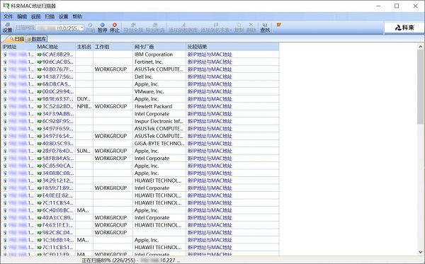 扫描结果涵盖 IP 地址、MAC 地址、主机名及网卡厂商。若存在一个 MAC 地址对应多个 IP 地址的情况,扫描器会自动识别并按对应关系正确显示。