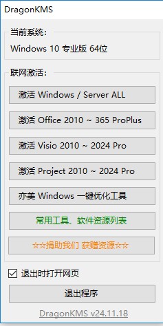 DragonKMS,也被称作“KMS神龙版”,作为一款功能卓越的KMS激活工具,能够支持激活Win11、Win10、Win8/8.1、Win7以及Win Server 2025/2022/2019/2016/2012/2008等诸多系统版本,涵盖专业工作站版、企业版、专业版、教育版、专业教育版、家庭版、核心版、中文版(专为OEM预装系统打造)、单语言版等,同时,它还支持激活Office 365/2024/2021/2019/2016/2013/2010 Proplus、Visio 2024/2021/2019/2016/2013/2010 Pro、Project 2024/2021/2019/2016/2013/2010 Pro等,凭借其高效、稳定及易用性,赢得了广大用户的赞誉。有需求的用户,欢迎下载体验!