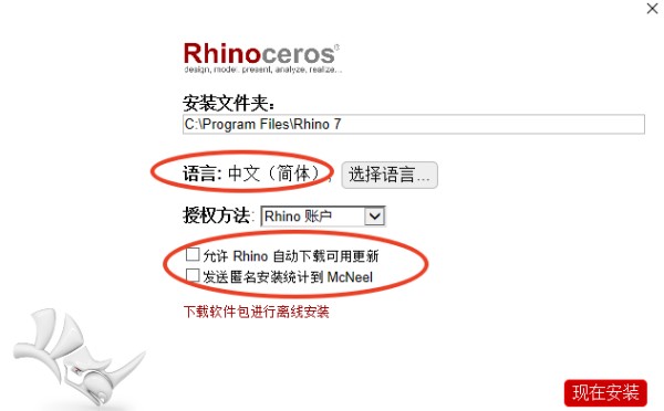 3、运行rhino_zh-cn_7.37.24107.15001.exe开始安装软件,点击右下角的齿轮设置。