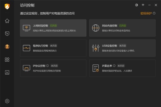 可控制上网时段、网站类型、USB设备等,对未成年人、陌生人设定访问权限