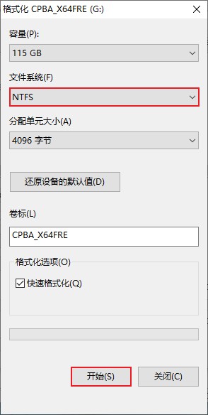 注意:格式化时选择NTFS文件系统,不要选择FAT文件系统,否则会无法引导出错。