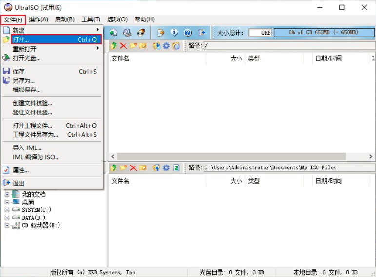 启动UltraISO软件,选择【文件】-【打开】菜单,来加载刚才下载的Windows10的ISO文件。