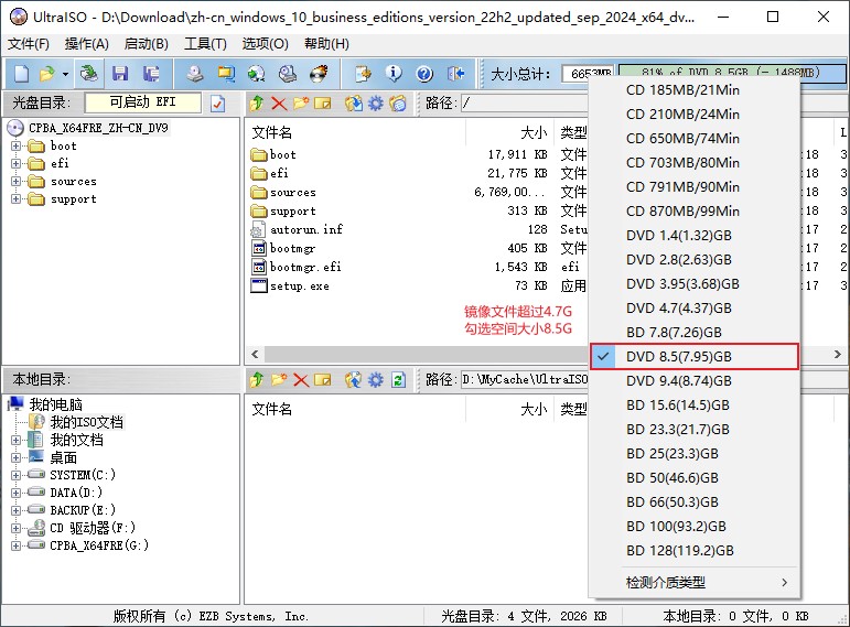 UltraISO加载成功后,显示ISO文件内容。在右上角有个显示文件大小功能,默认是4.7G,但是安装文件6G多,所以选择8.5G空间,这也是微软官方叫你准备一个大于8G空间U盘的原因。