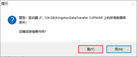 软件提示:如果U盘上有数据,将全部丢失。如果不需要备份U盘数据,点击【是】按钮开始刻录。