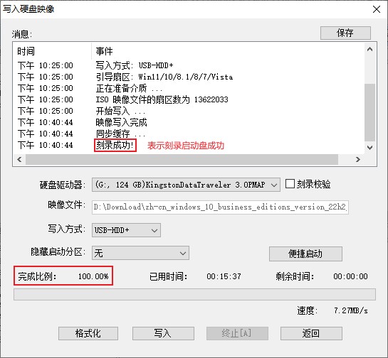软件提示刻录成功,完成比例100%后,恭喜你系统启动盘制作成功。点击【返回】按钮,关掉UltraISO软件即可。