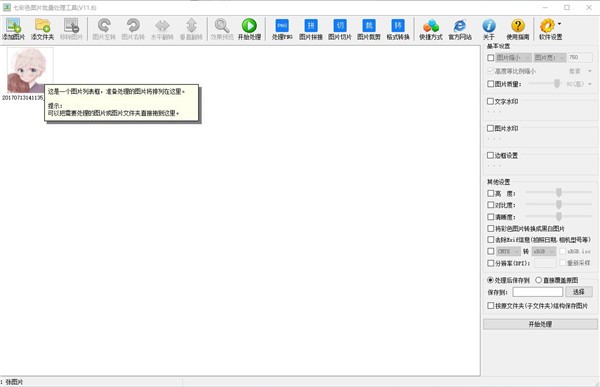 七彩色图片批量处理工具可以让用户批量处理图片了,不管是加水印还是缩小、调整亮度都可以,界面比较的简洁,点击左上角的添加图片,就可以自由的设置参数了,实现图片压缩、还能自由的调整尺寸,比较适用于淘宝卖家,摄影师打logo等一些工作的需要,所有的图片全部可以批量一键处理,处理后的格式用JPG格式保存。