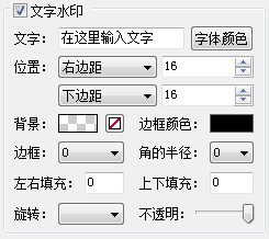 根据上图我们可以看到,添加文字水印时,我们可以设置文字水印的内容,显示位置,背景色,边框颜色,旋转角度和不透明度等。