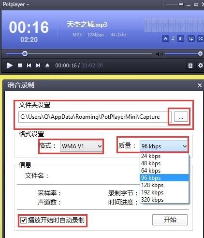 3、在“语音录制”对话框中分别设置输出文件夹设置、(输出)格式、质量,记得勾选“播放开始时自动录制”复选框,然后点击“开始”按钮。