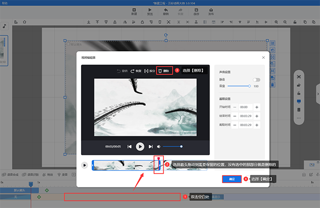 - 新建工程,导入需要剪辑的视频,并在画布中调整导入视频的大小,然后双击视频“行”空白处,弹出“视频编辑器”窗口,在视频下方的时间轴上拖动“开始时间线”和“结束时间线”截取需要删除的视频片段,或者在右侧输入开始时间、结束时间,然后选择上方【删除】,设置好音量后点击【确定】即可。