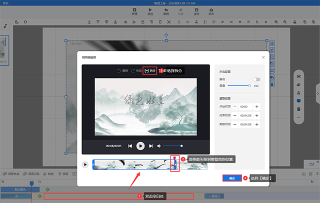 - 新建工程,导入需要拆分的视频,并在画布中调整导入视频的大小,然后双击视频“行”空白处,弹出“视频编辑器”窗口,在视频下方的时间轴上将“开始时间线”、“结束时间线”拖动到视频切割时间点上,或者在右侧输入开始时间、结束时间,然后选择上方【拆分】,设置好音量后点击【确定】即可。