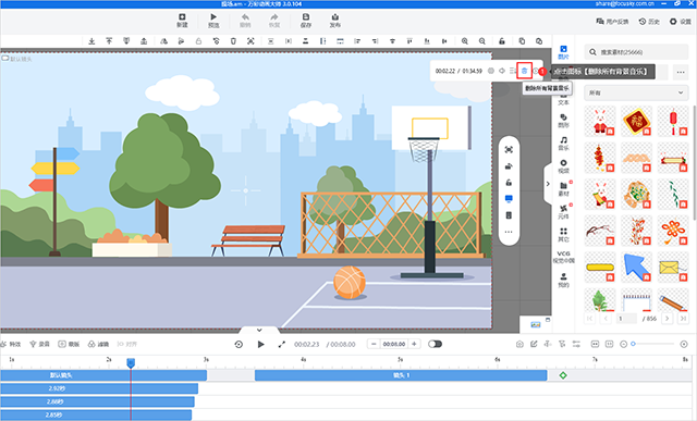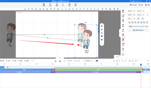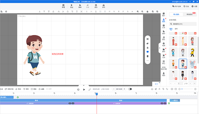 1、时间轴设计,支持精确控制元素出场顺序、动画效果(如移动、旋转、缩放)及持续时间。