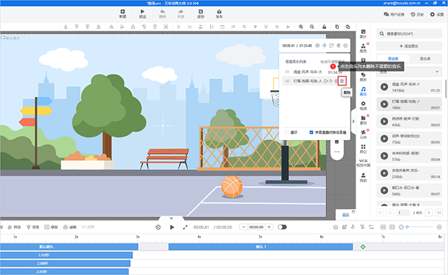 如只需删除其中一首音乐,可以先点击【背景音乐列表】,鼠标移动到需要删除的那首音乐上,点击【删除】键.