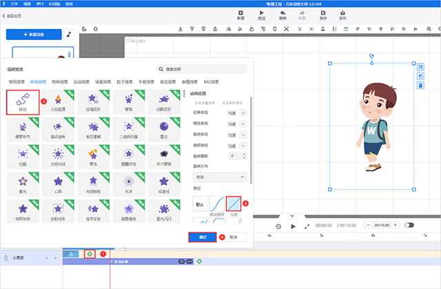 新建工程,在画布中添加带有走路动作的角色,选择【+】添加强调效果,弹出默认窗口选择【移动】,移动速度选择右侧【匀速】效果,点击【确定】