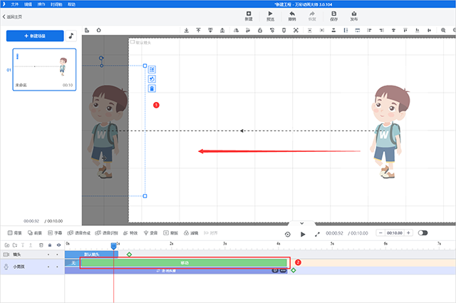 人物移动到镜头外,然后把移动滑块拉到与人物的动作滑块对齐,然后点击预览效果即可