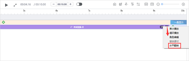 还是用上面的人物来举例,在刚刚我们已经添加好的人物动作滑块后面再添加一个走路的动作滑块,点击动作滑块后面的图标【...】中的【水平翻转】让人物转身,然后增加移动的强调效果,跟上面的操作步骤一样