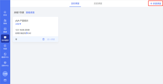 1、点击【老师端】-实时课堂模块右上角的【新建课堂】按钮来创建新的实时课堂: