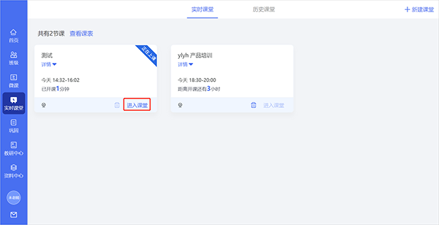 3、打开老师端,选择【实时课堂】菜单,您就可以在右侧的课堂列表中看到您创建的课堂,点击【进入课堂】即可开始上课: