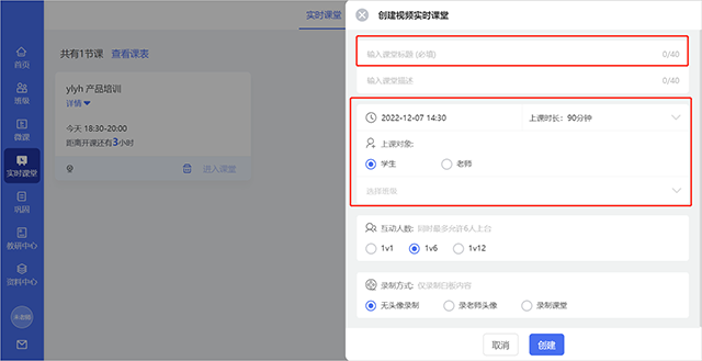 2、填写对应的课堂信息,选择需要上课的班级后,点击【创建】即可: