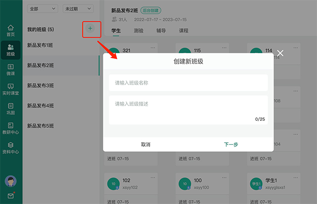 点击“+”可以创建班级,如果是后台创建的班级,会带有“后台创建”标识