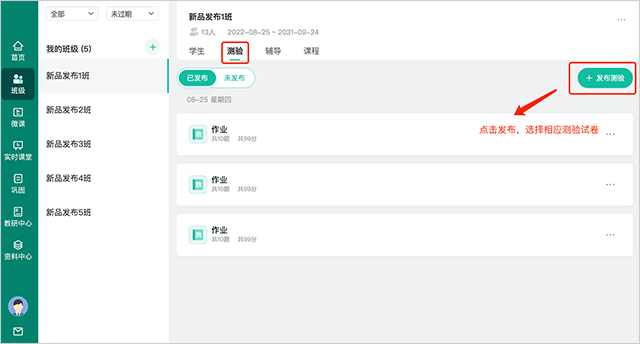 老师发布测验时使用【我的试卷】进行发布,支持设置分值、起止时间、答题时间、答题班级,是否需要批改,点击发布即可