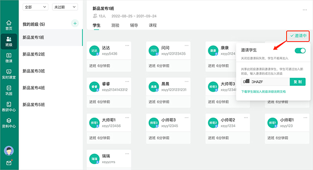 学生端可以在班级模块点击加入新班级,输入邀请码即可加入该班级。