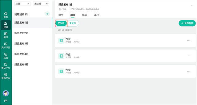 已发布的测验可以在“已发布”里查看,定时下发的测验在“未发布”里查看,且未发布的测验支持删除