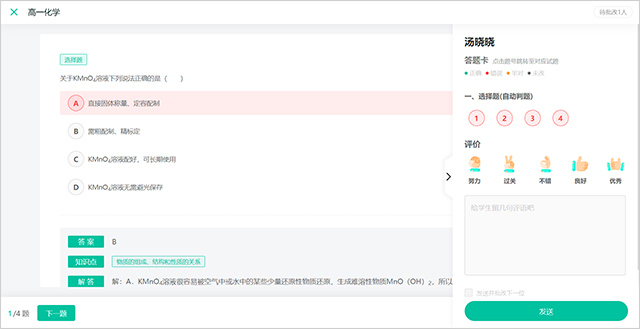 点击待批改即可对学生的提交的巩固进行批改,支持答案解析、自动判断、手动判断、学生评价等