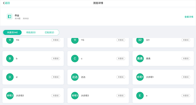 点击已发布的测验,可以查看测验详情以及学生提交情况。