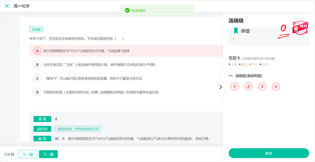 老师批改完点击发送,学生收到试卷的批改详情且学生可查看此份试卷的测验报告