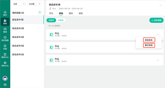 针对已批改过的测验,老师可查看测验报告,也可撤回测验,撤回后的测验支持删除