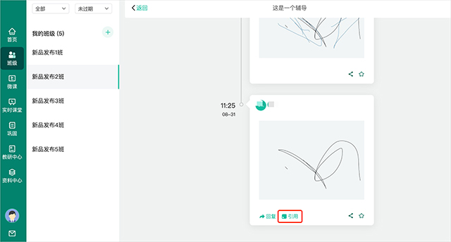 下面以电脑端为例,在辅导“未回答”中,点击“引用”,弹出“我的收藏”列表,找到可以引用的答案,点击即可发送
