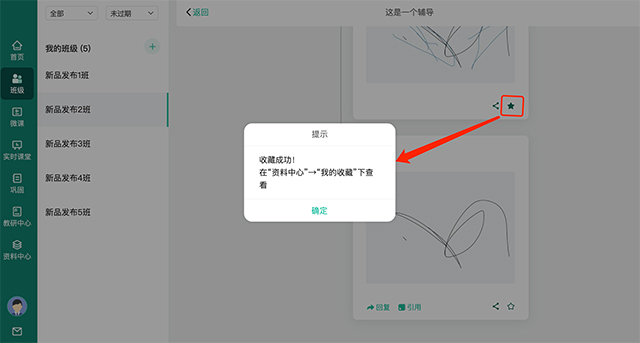 当出现共性问题时,老师可以直接引用收藏夹里的视频内容进行回复,减少重复工作量;同时,在遇到经典问题及重复问题时,老师可将录制的答案和问题进行收藏,收藏至“资料中心”-“我的收藏”中,便于后期再使用。