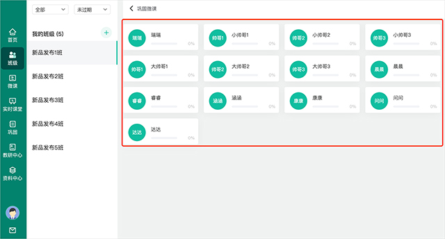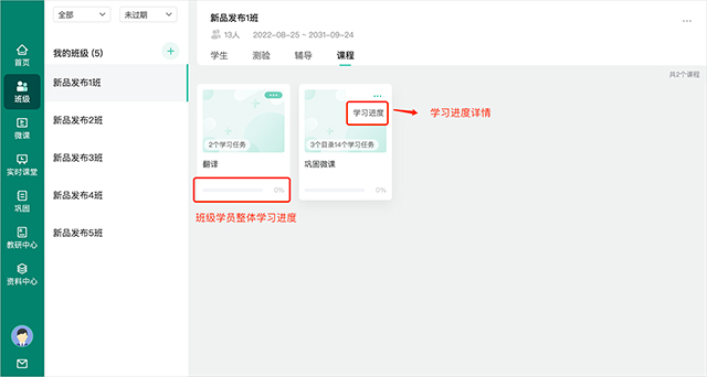 课程内容来源后台下发和老师分享的课程包,班级内学生和老师均可查看班级的课程,老师可以按课程包和内容维度查看班级整体和每个人的学习进度