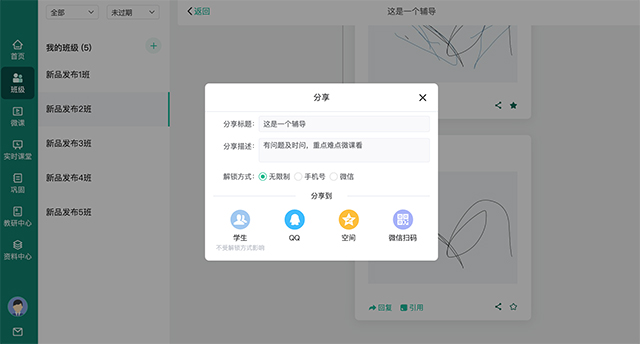 未回答和已回答的问题,支持分享给学生、QQ、空间,或分享二维码做宣传
