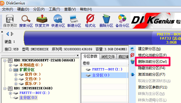 2、右击一个分区,在出现的菜单中选择“删除当前分区”。