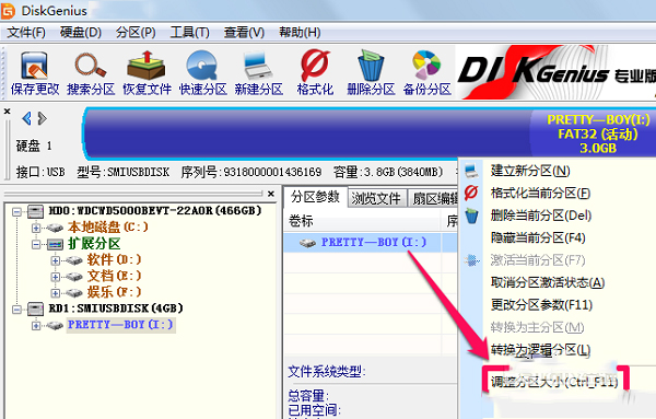 5、之后右击唯一的分区,点击菜单中的“调整分区大小”。
