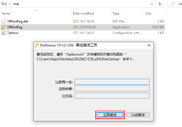 6、在可以上网的电脑上,双击"OfflineReg.exe" 文件,然后点击"立即激活"按钮。如下图所示: