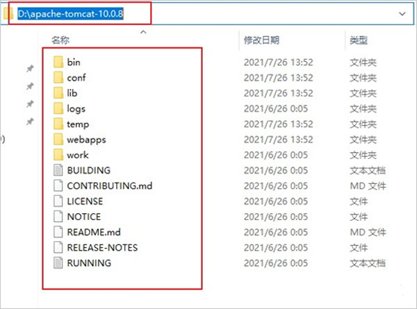 1、将下载好的“tomcat_218199.rar”解压为“apache-tomcat-10.0.8”放至“D:”