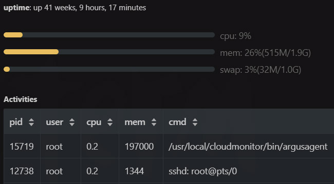 点右下角的Terminal info可查看服务器CPU、内存、网络等信息。