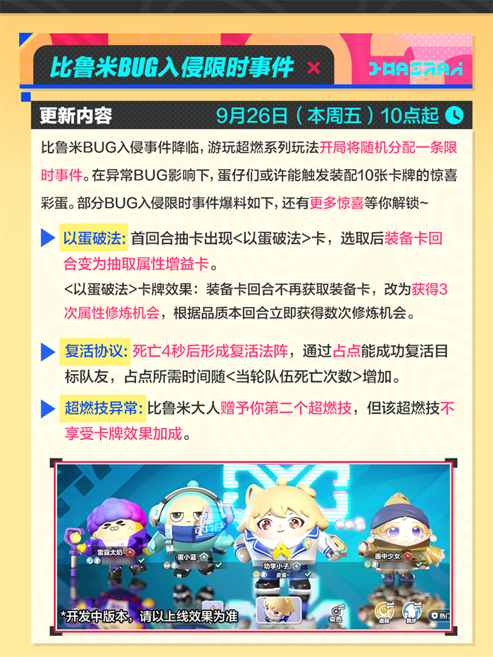各位蛋仔玩家注意啦!一场超燃风暴即将席卷蛋仔岛。《蛋仔派对》超燃大乱斗9月26日(本周五)10点重磅更新!比鲁米大人的神秘BUG强势入侵超燃战场,会掀起怎样的疯狂?还有平衡性调整暗藏玄机,更多惊喜等你探索,速来围观!