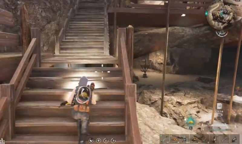 - 入口是一个隧道洞口,里面有木制台阶和岩壁构成的通道。